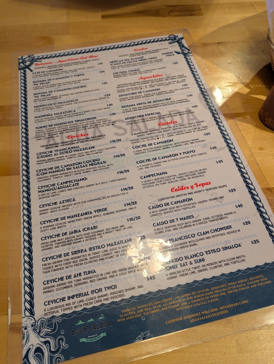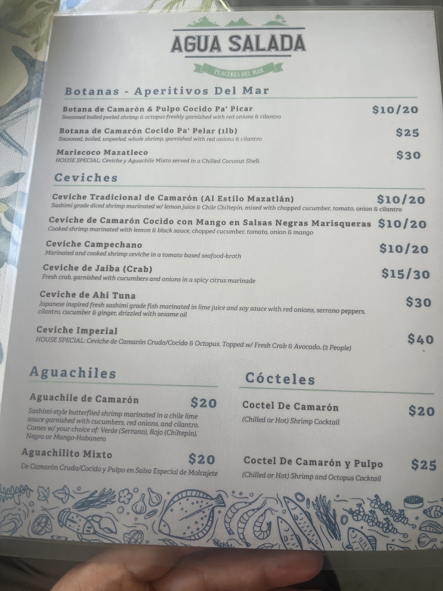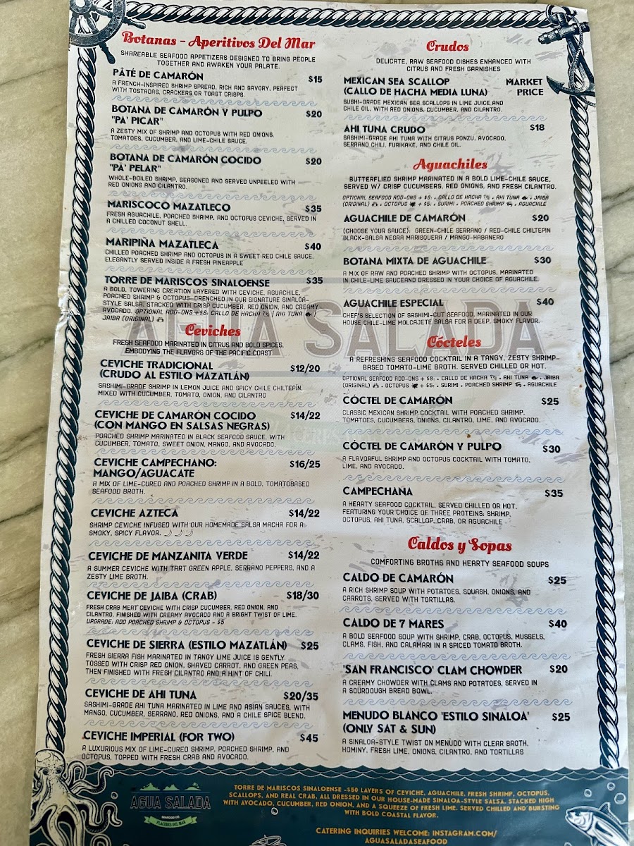 From a reviewer’s perspective, Agua Salada’s menu offers an impressively diverse and indulgent take on contemporary Mexican seafood, even though many items don’t list prices. The grill section stands out with hearty options like Tomahawk Ribeye Aguachile, Pollo Asado, and Arachera Prime Carne Asada, while the taco lineup shines with favorites such as Tacos Gobernador (Char-Grilled Shrimp Tacos) (3), Super “Baja Style” Fish Tacos (3), and the flavorful Tacos De Pulpo Asado (Char-Grilled Octopus Tacos) (3). Their bowls, including Chicken & Shrimp Bowl and Steak & Shrimp Bowl, offer satisfying combinations, and the soups like Caldo De Camarón, Menudo Blanco “Estilo Sinaloa”, and Caldo 7 Mares provide comforting depth. The ceviche selection is particularly vibrant, featuring Ceviche De Camarón Con Mango (En Salsas Negras), Ceviche Tradicional (Al Estilo Mazatlán), and Ceviche Campechano, alongside raw specialties like Mexican Scallop Aguachile (Callo De Hacha Media Luna) and Ahi Tuna Crudo. Fusion lovers will appreciate the sushi offerings such as Currican Sushi Rolls and “De Cielo, Mar Y Tierra”, while classics like Aguachile De Camarón and Cóctel De Camarón Y Pulpo highlight the restaurant’s coastal roots. Additional highlights include Empanadas De Camarón (2), Quesabirrias De Res (3), and seafood entrées like Camarónes Al Mojo De Ajo and Camarónes Culichi, all complemented by sides like Guacamole and Mexican Rice. Overall, the menu feels abundant, creative, and deeply rooted in Sinaloan flavors, making it a compelling destination for seafood enthusiasts.
