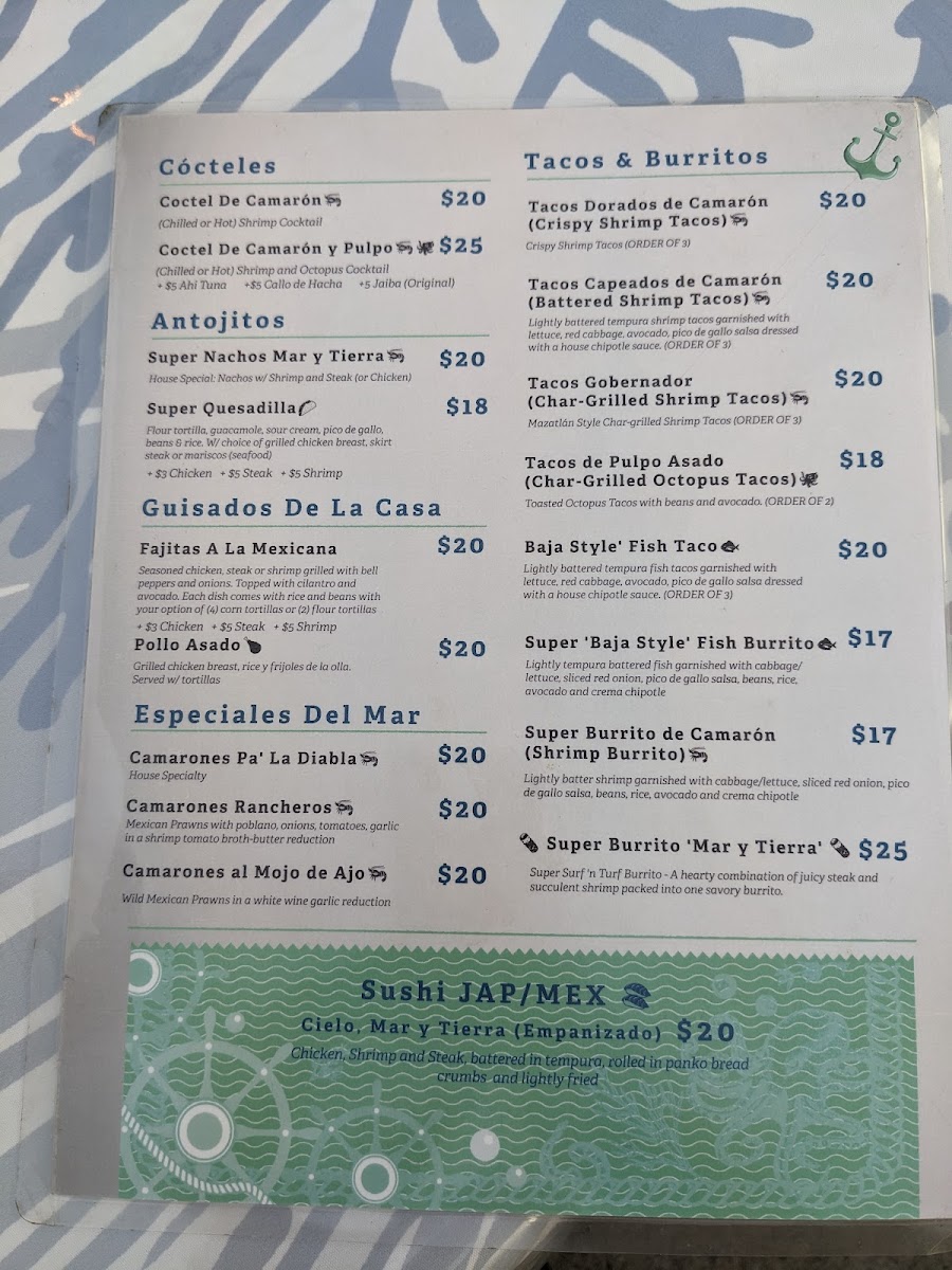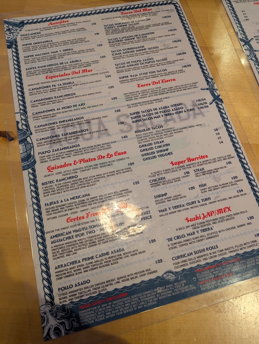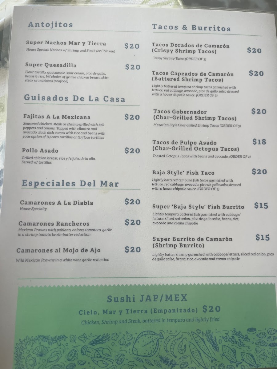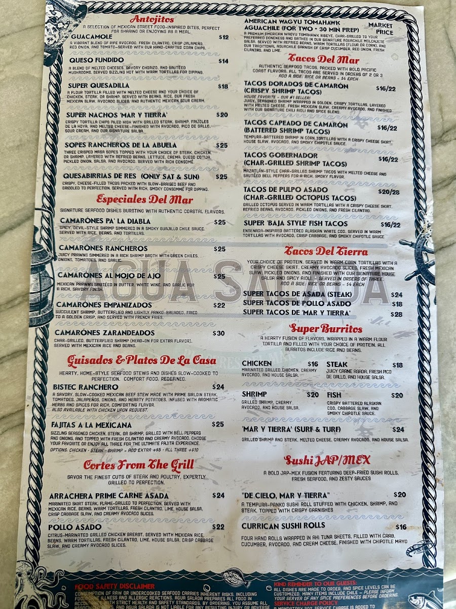 From a reviewer’s perspective, Agua Salada’s menu offers an impressively diverse and indulgent take on contemporary Mexican seafood, even though many items don’t list prices. The grill section stands out with hearty options like Tomahawk Ribeye Aguachile, Pollo Asado, and Arachera Prime Carne Asada, while the taco lineup shines with favorites such as Tacos Gobernador (Char-Grilled Shrimp Tacos) (3), Super “Baja Style” Fish Tacos (3), and the flavorful Tacos De Pulpo Asado (Char-Grilled Octopus Tacos) (3). Their bowls, including Chicken & Shrimp Bowl and Steak & Shrimp Bowl, offer satisfying combinations, and the soups like Caldo De Camarón, Menudo Blanco “Estilo Sinaloa”, and Caldo 7 Mares provide comforting depth. The ceviche selection is particularly vibrant, featuring Ceviche De Camarón Con Mango (En Salsas Negras), Ceviche Tradicional (Al Estilo Mazatlán), and Ceviche Campechano, alongside raw specialties like Mexican Scallop Aguachile (Callo De Hacha Media Luna) and Ahi Tuna Crudo. Fusion lovers will appreciate the sushi offerings such as Currican Sushi Rolls and “De Cielo, Mar Y Tierra”, while classics like Aguachile De Camarón and Cóctel De Camarón Y Pulpo highlight the restaurant’s coastal roots. Additional highlights include Empanadas De Camarón (2), Quesabirrias De Res (3), and seafood entrées like Camarónes Al Mojo De Ajo and Camarónes Culichi, all complemented by sides like Guacamole and Mexican Rice. Overall, the menu feels abundant, creative, and deeply rooted in Sinaloan flavors, making it a compelling destination for seafood enthusiasts.